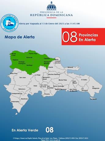 Las provincias en alerta verde son: Monte Cristi, Espaillat, Santiago Rodríguez, Hermanas Mirabal, Dajabón, Santiago, Puerto Plata y Valverde.